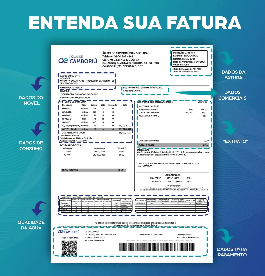 Você sabia que todas as informações necessárias sobre a sua conta, estão em sua fatura? Todos os meses a Águas de Camboriú te atualiza com dados importantes como o consumo mensal, informações sobre o imóvel, as formas de pagamento e extrato da conta. Quer aprender mais? Confira abaixo cada tópico da fatura: